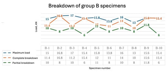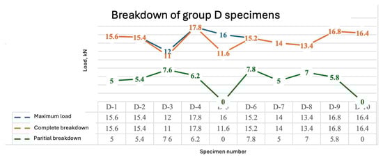 Experimental data showed that in all sample types, complete disintegration can occur before the maximum vertical load is applied. The average load at which such disintegration was observed was 14.52 kN for group A specimens, 13.28 kN for group B specimens and 14.72 kN for group D specimens.