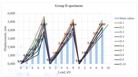 Despite the complete disintegration of the structure, the specimens maintained a certain load-bearing margin until the final moment of failure. After disintegration, the unreinforced adhesive layer group A specimens still resisted approximately 1.87 kN. On the other hand, the specimens of group B and type D, where the adhesive layer was reinforced with glass fibre yarns, showed a significantly higher residual load capacity of 3.5 kN on average.