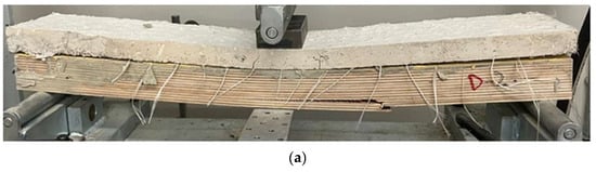 Although group B specimens achieved higher load capacities than groups A and D, they exhibited higher adhesive timber-to-concrete connection weakness due to imperfect adhesion. All group B specimens disintegrated (at lower loads than groups A or D), and a division of the glass yarns into smaller parts was observed.