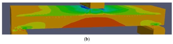 It can be observed that there is significant local compression–tensile splitting stress around the load application area (see local damage in Figure 23). The experimental failure mode also showed such local concrete damage around the load application area (see Figure 19a).