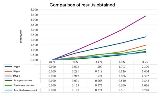 Comparing these values with the experimental results, the model with a compliant joint shows a smaller percentage difference of 17.54%, while the model with a rigid joint differs by 20.54%. Although this does not achieve a perfect match in either case, the model that considers a compliant connection between the layers provides a closer match in bearing capacity and deflection values.