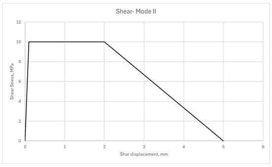 The simulation model was validated with the obtained experimental measurements. Concrete and timber (see Table 2) material properties were obtained for that purpose. Based on glue properties, it was assumed that the tensile strength of the glue layer was equal to 1 MPa and the compressive strength was 3 MPa (similar to concrete strength perpendicular to grain, see Figure 20). Shear stiffness and strength function depending on shear displacements are shown in Figure 21. This function was tailored to combine the numerical results with experimental results. It can be seen in Figure 22 that the assumed and obtained material properties demonstrate good accuracy compared to the experimentally measured load-displacement curve.