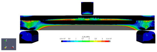 Horizontal stress Sxx (MPa) at 14 KN load shows only tensile regions in the range 0 to 3.5 MPa (corresponding to concrete tensile strength).