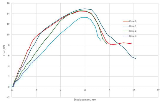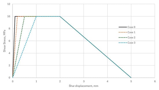 By using the validated numerical FEM model, we performed a numerical study to understand better how the stiffness of a glued joint can affect the overall sample strength and stiffness. Three additional shear load–slip curves (Figure 26) were implemented in the FEM model and the results were checked. Cases 0, 1, 2 and 3 had 1×, 2×, 5× and 10× times smaller joint stiffness values (see Table 3). According to the obtained load-displacement curves (see Figure 27), it was visible that up to 5 times smaller glued joint stiffness will not have a significant impact on structural strength. When there was 10× smaller joint stiffness, the peak load was about 7% smaller. For 2× smaller joint stiffness, the overall structural bending stiffness was not significantly affected.