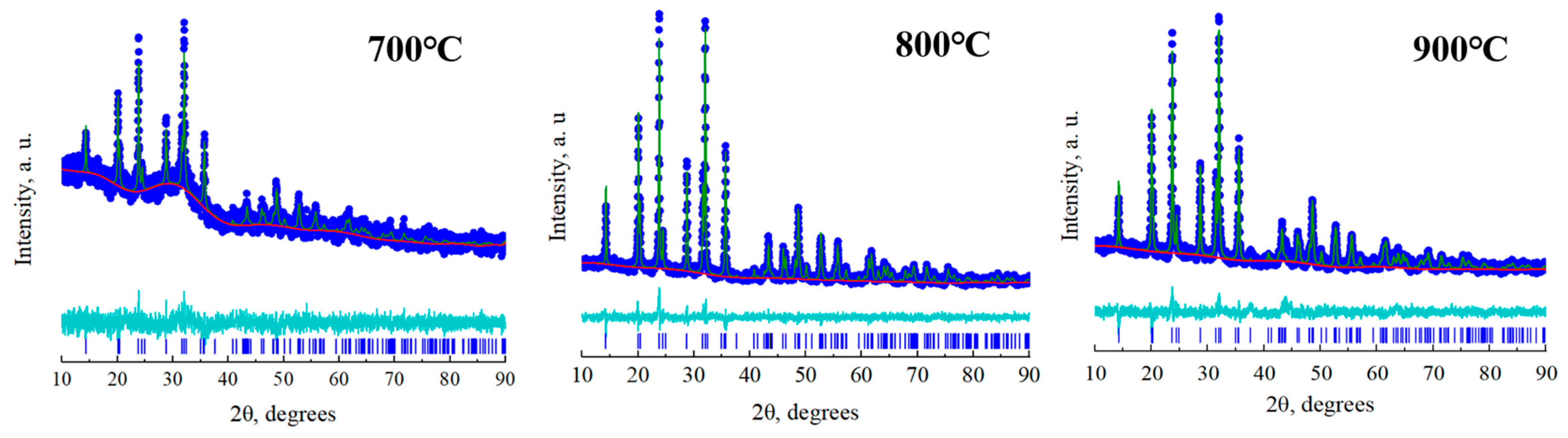 - Toby, B.H.; Von Dreele, R.B. GSAS-II: The genesis of a modern open-source all purpose crystallography software package. J. Appl. Crystallogr. 2013, 46, 544–549. [Google Scholar] [CrossRef]