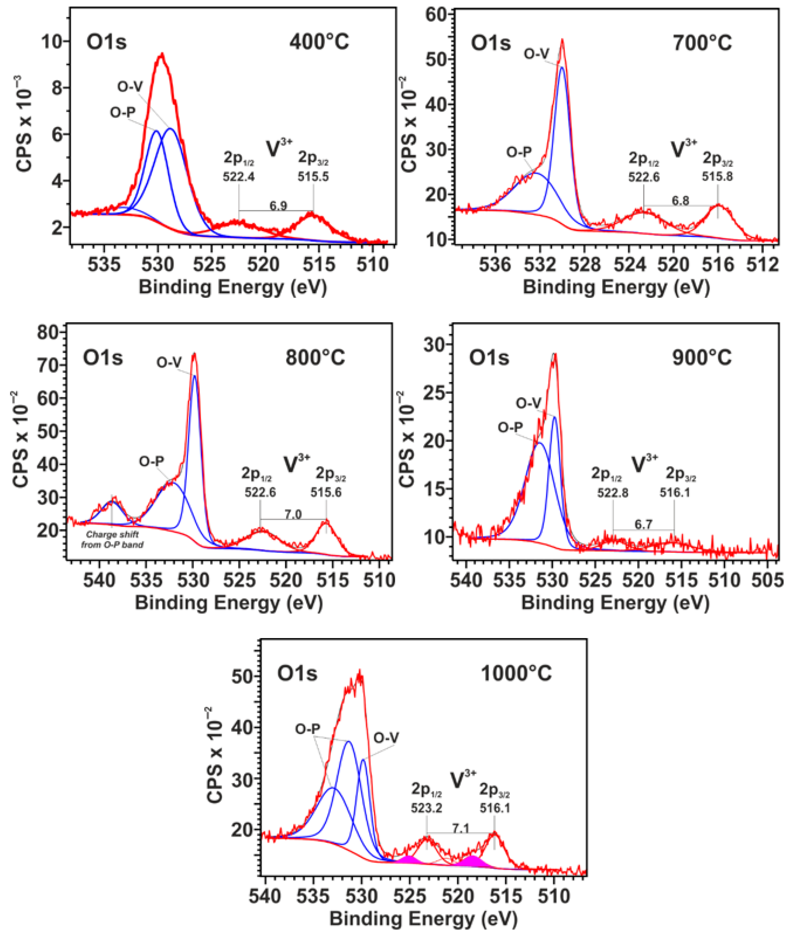 - Silversmit, G.; Depla, D.; Poelman, H.; Marin, G.B.; De Gryse, R. Determination of the V2p XPS binding energies for different vanadium oxidation states (V5+ to V0+). J. Electron. Spectros. Relat. Phenom. 2004, 135, 167–175. [Google Scholar] [CrossRef]