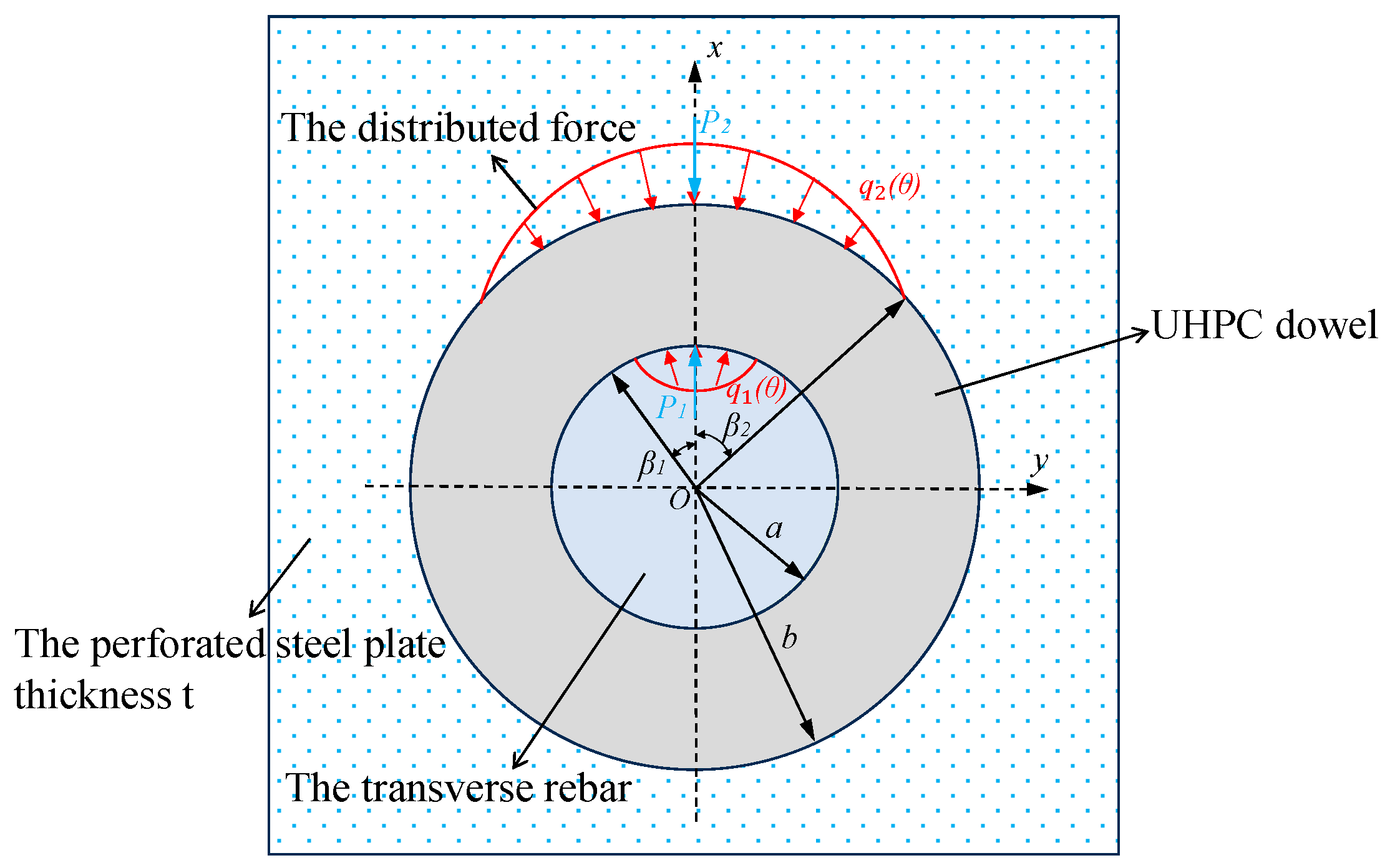 - The mechanical behavior of PBL shear connectors in UHPC can be divided into elastic, plastic, and ductile stages. During the elastic stage, the load is jointly carried by the UHPC dowel and transverse rebar. Based on their respective mechanical characteristics in this stage, the system can be idealized as a plane strain problem for the UHPC dowel and the Winkler elastic foundation beam model for the transverse rebar.