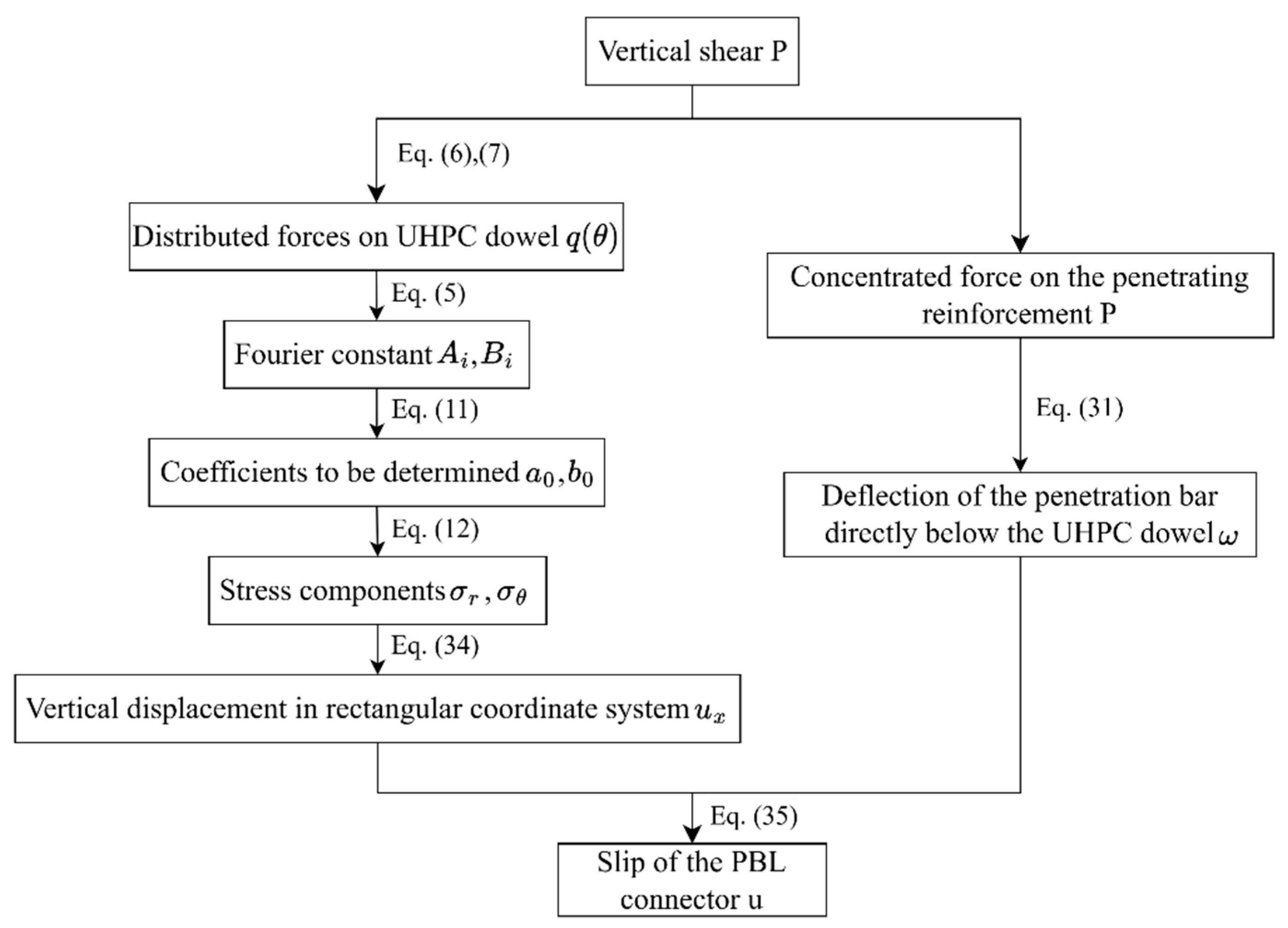 - The UHPC dowel can be simplified as a plane strain problem of a thick-walled cylindrical shell subjected to non-axisymmetric loads on both inside and outside surfaces. The stress and displacement analytical solutions of the UHPC dowel are derived by analyzing the Airy stress function expressed in polar coordinates. For the Winkler elastic foundation beam problem of transverse rebar, establish analytical solutions for its deflection, rotation, bending moment, shear force, and the corresponding stress calculation formulas. The relative slip associated with the shear force can be obtained by superimposing the elastic displacement of the UHPC dowel with the rigid body displacement of the transverse rebar.