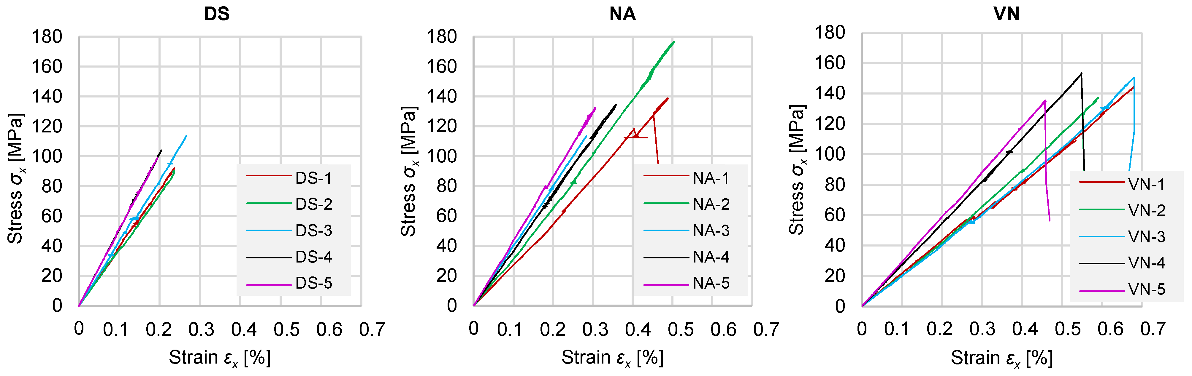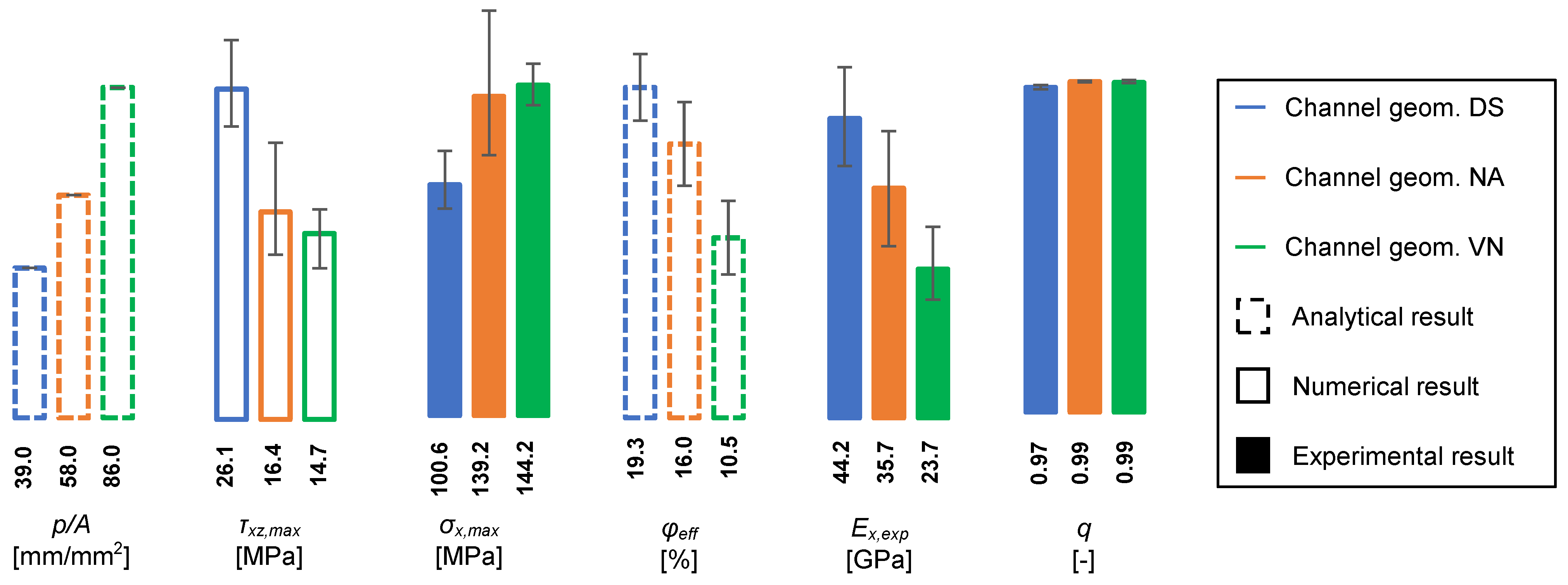 No. | Fx,max [kN] | Ex,eff,exp [GPa] | ∆Ex [GPa] | ∆Ex/Ex,eff,analytical | εx,max [%] | σx,max [MPa] |