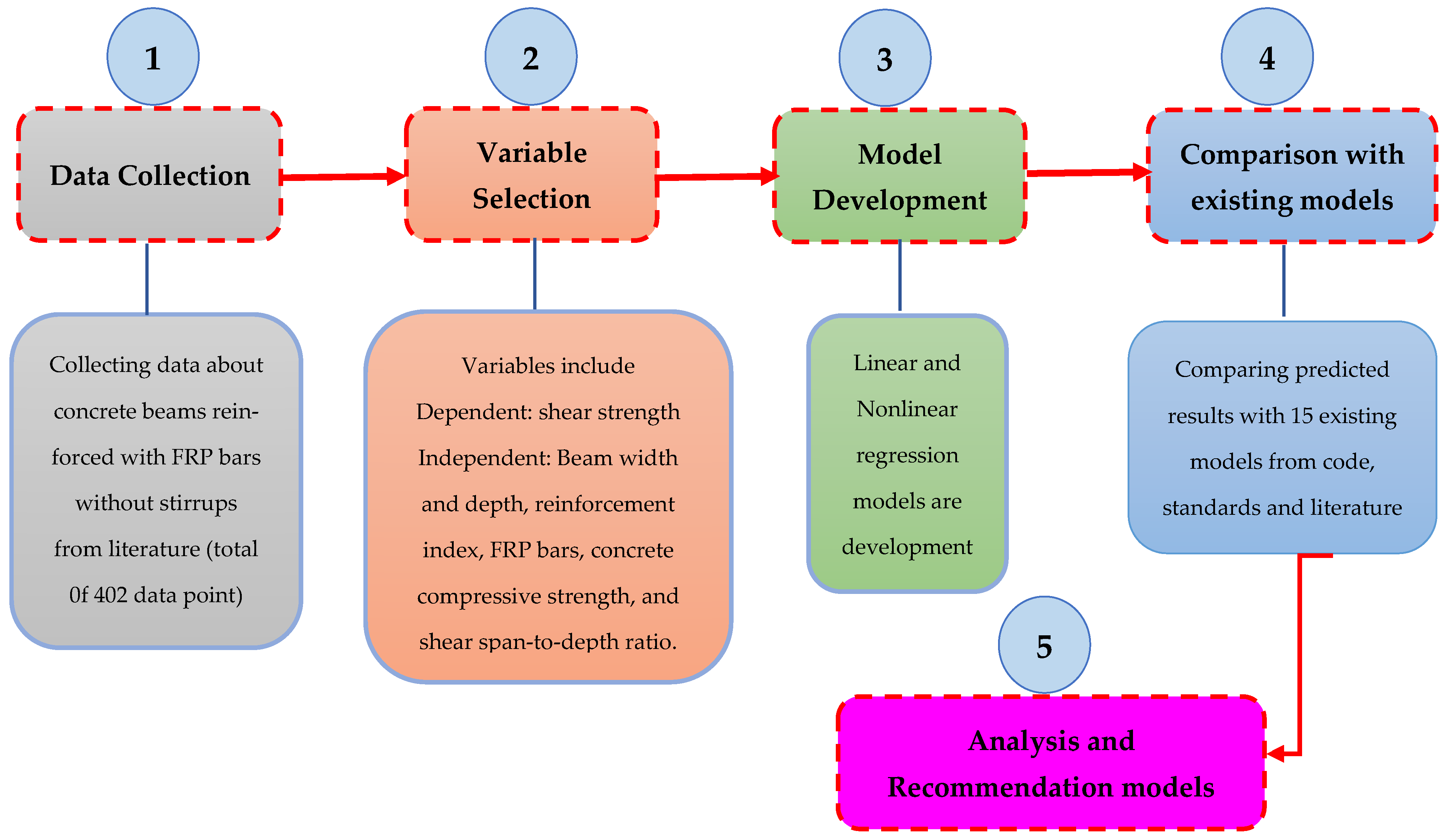 - Data Collection: The study uses a database of 402 data points from experimental tests on concrete beams reinforced with FRP bars without stirrups. These data were collected from existing literature as demonstrated in Table 1.