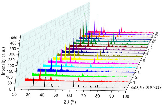 Diffraction profiles of the 16 films obtained via ultrasonic spray pyrolysis.