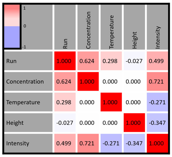 The Figure 2 shows a correlation grid for the preliminary analysis of the design of experiments (DoE), which considers the three factors and the response variable. The grid is color-shaded to visually represent the degree of correlation between each variable, where red indicates a strong positive correlation and blue indicates a negative correlation. The numerical values in each cell provide an accurate quantification of the correlation coefficients.
