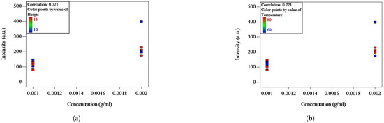 Among the evaluated factors, the concentration of the suspension () exhibits the strongest correlation with the response variable, with a coefficient of 0.721, indicating a notable direct association between the two. In contrast, substrate temperature () and deposition height () present lower correlation coefficients of −0.271 and −0.347, respectively. The factors exhibited distinct trends, concentration had a positive effect, while substrate temperature and deposition height displayed negative effects. An increase in the concentration of the suspension is likely to raise the amount of cassiterite (SnO2) delivered to the substrate, promoting denser packing or preferred orientation, which in turn increases the measured XRD peak intensity. By contrast, higher substrate temperatures can accelerate solvent evaporation before or at impact, yielding less uniform coverage and a reduction in the observed intensity. Subsequently, scatter plots were plotted to investigate the relationship between the response variable (Intensity) and the concentration of the suspension, while also accounting for stratification according to two critical process factors, specifically the deposition height and the substrate temperature, as illustrated in Figure 3.