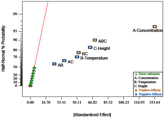 Each point on the plots corresponds to the measured intensity associated with a specific combination of experimental conditions, with color differentiation used to indicate the respective levels of height (Figure 3a) and substrate temperature (Figure 3b). In Figure 3a, where color represents deposition height, a clear stratification is observed at both low (0.001 g/mL) and high (0.002 g/mL) concentrations. Films deposited at the shorter nozzle–substrate distance (10 cm) exhibit higher intensities than those at 15 cm, consistent with greater delivered mass/coverage of cassiterite (SnO2) and/or stronger preferred orientation at reduced spray distances. This trend is attributable to more efficient delivery of solids to the substrate and reduced loss of deposit during transport, which favor continuous coverage and texture development. In contrast, Figure 3b) displays stratification based on substrate temperature. At lower concentrations of the suspension, films deposited at 60 °C exhibit slightly higher intensity values compared to those synthesized at 80 °C. At higher concentrations, although the difference becomes less pronounced, a general trend of decreasing intensity with increasing substrate temperature remains evident. This behavior likely reflects changes in evaporation kinetics and surface redistribution at higher temperatures that lessen local continuity and attenuate the diffracted signal. Nevertheless, these scatter plot observations represent a preliminary assessment; a more comprehensive analysis of the factor interactions will be discussed subsequently. Figure 4 presents the half-normal probability plot for the standardized effects of the process factors (X1 = A, X2 = B, X3 = C) and their interactions on the response variable (Intensity).
