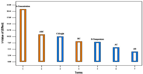 The chart arranges the effects according to their absolute t values, a dimensionless metric that normalizes each effect relative to its associated standard deviation. This representation allows for a direct comparison between the individual parameters and their interactions. As expected, concentration (A) appears as the most influential parameter, in agreement with the results obtained from the correlation analysis and the half-normal plot. The interaction involving all three factors ABC also shows a considerable magnitude, indicating that the combined variation of concentration, substrate temperature, and deposition height contributes significantly to the structural characteristics of SnO2 films. While individual effects such as deposition height (C) and substrate temperature (B) are less pronounced, their interactions in particular BC demonstrate the complex nature of the deposition process, in which the response is influenced by the interaction of multiple variables, rather than by isolated parameter changes alone.