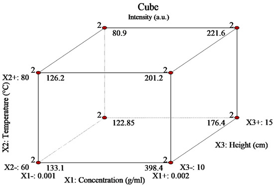 Table 2 summarizes the design disposition, including the encoded levels of the process factors and the response variable, Intensity (a.u.) (Y), recorded for each process setting combination with its replicate (totaling 16 films).