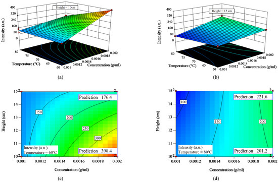 Response surface and contour plots for intensity as the response variable. (a) Response surface plot showing the interaction between the concentration of the suspension and the substrate temperature at a lower deposition height (10 cm). (b) Response surface plot showing same interaction at a higher deposition height (15 cm). (c) Contour plot illustrating the interaction between concentration and deposition height at lower temperature (60 °C). (d) Contour plot illustrating same interaction at higher temperature (80 °C).