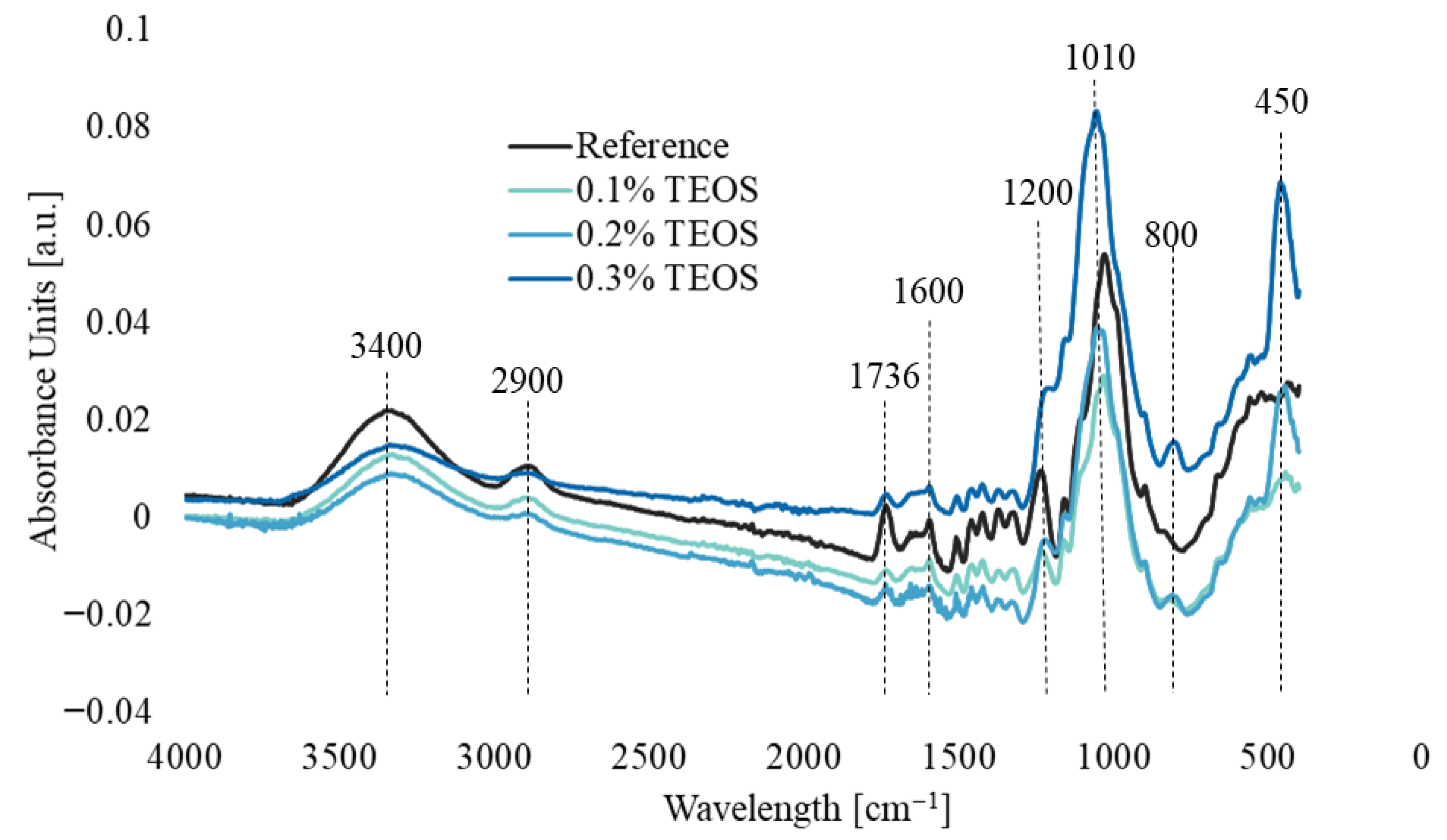 | 0.1% TEOS | 316 ± 3 | 327 ± 4 | 360 ± 1 | 255.9 ± 2 | 323.1 ± 6 | 1.2 ± 8 |