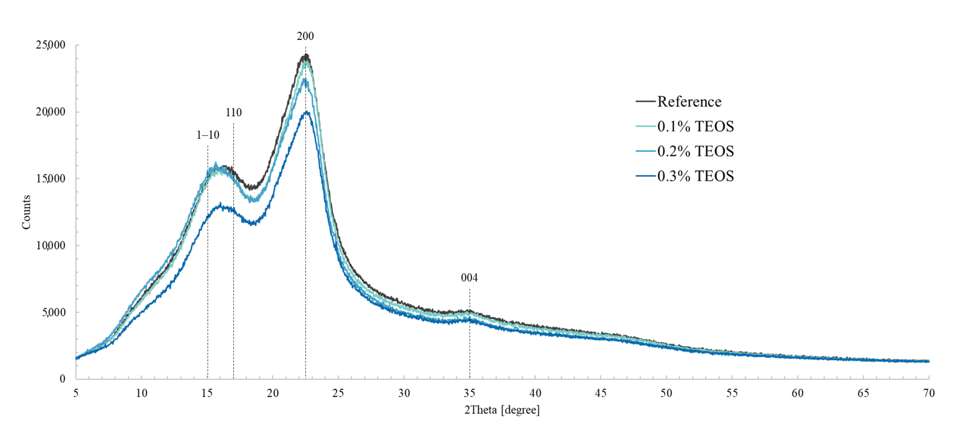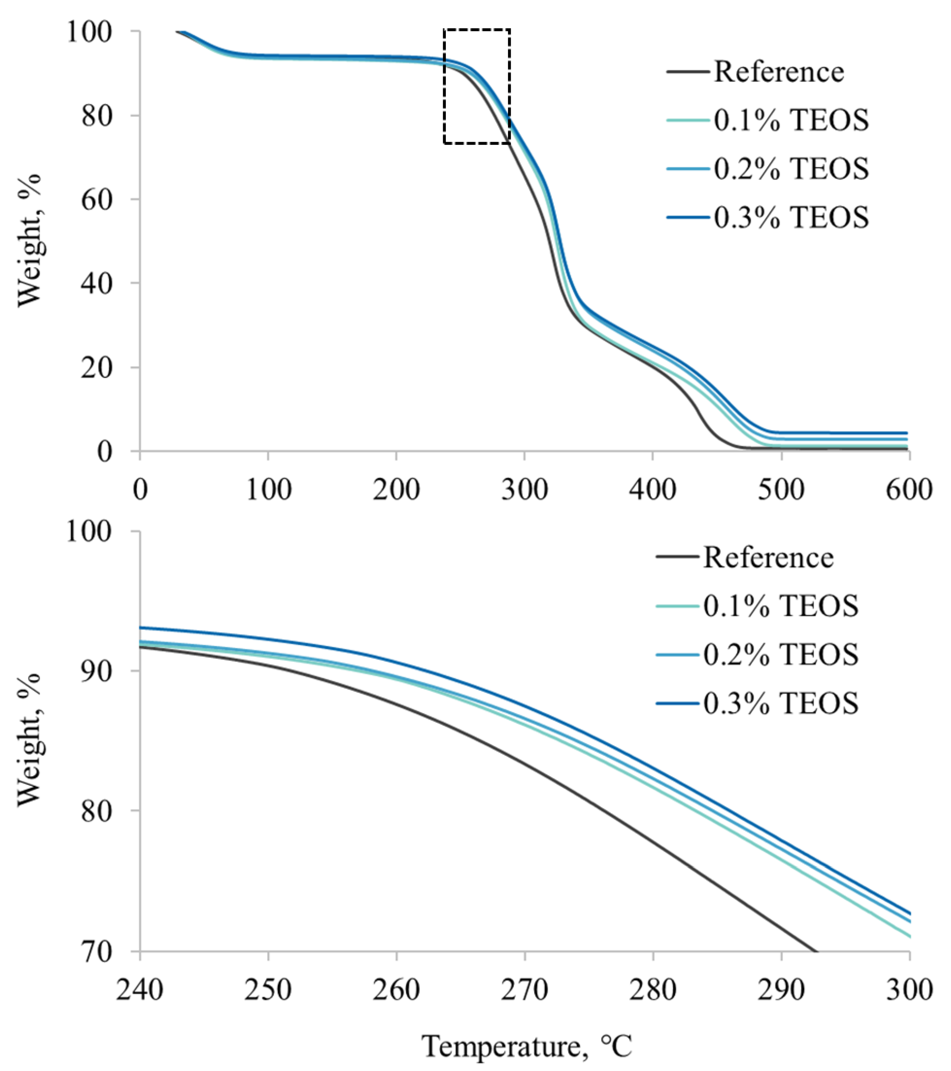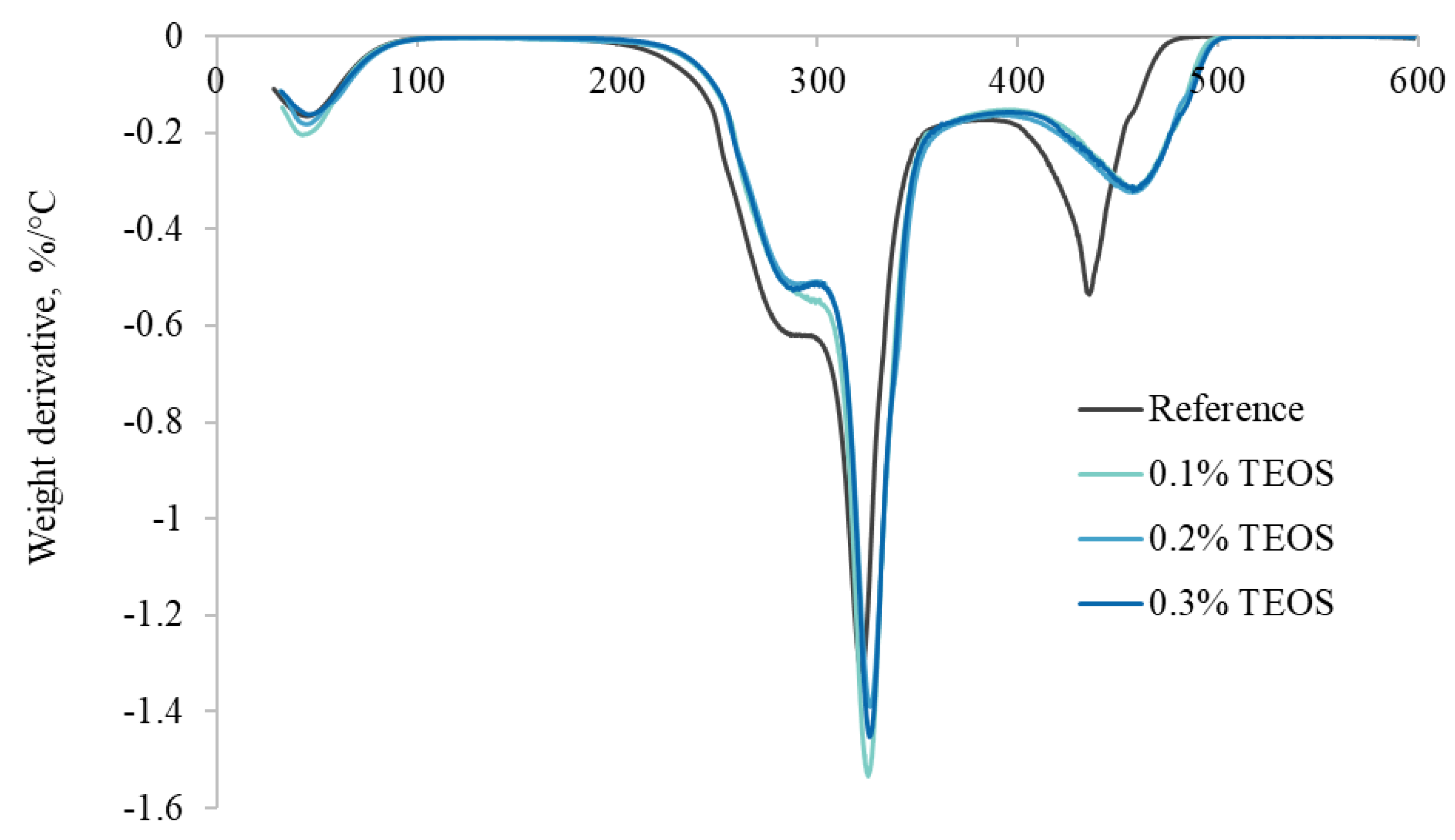 | 0.3% TEOS | 316 ± 6 | 326 ± 2 | 358 ± 7 | 255.5 ± 7 | 322.8 ± 4 | 4.3 ± 3 |
