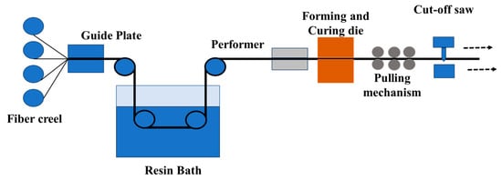 Polymer composites are produced through a variety of processes that are specifically designed to accommodate the matrix properties. Thermoset composites, which are thermally stable and have high strength, are typically manufactured using hand lay-up technique, resin transfer molding (RTM), filament winding, and pultrusion. In contrast, thermoplastic composites, which are regarded for their toughness and recyclability, are frequently made by injection molding, compression molding, thermoforming, and pultrusion. Among these methods, pultrusion is a continuous, automated process that enables excellent production efficiency and cost-effectiveness, particularly for components with uniform cross-sections [,]. Moreover, pultrusion supports both thermoset and thermoplastic resins, offering material versatility and flexibility in design for complex shapes.