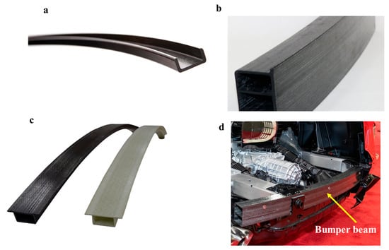 Figure 2. Examples of curved pultruded parts: (a) elegant arcs, (b) curved hollow part, (c) curved CFRP bumper, and (d) rear bumper beam (highlighted with arrow) of a Chevrolet Corvette sports car’s curve pultruded part [].