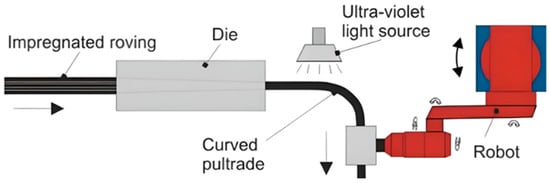 Pultrusion is traditionally employed to produce straight, elongated composite. But, when fibers are bent, twisted, or crimped within a cured matrix, they can lose some of their advantageous mechanical properties, compromising the structural integrity and desired functionality of the composite [,]. Although standard pultrusion techniques are ideal for creating straight profiles, recent advancements have enabled the production of curved parts for various applications [], as illustrated in Figure 2.