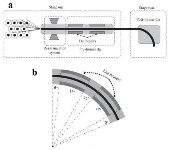 After exiting the die, UV light cures the resin allowing for precise manipulation of the fiber placement during curing []. This technique limits the die’s function to shaping the profile, significantly reducing pulling pressures and enabling the formation of radii and corners. However, this approach is primarily suitable for simple curves and lacks the versatility required for more complex geometries. An alternative technique, molded pultrusion, integrates a curved mold or die into the production process, allowing for the continuous formation of intricate shapes [] (Figure 4a). Figure 4b illustrates how the die heaters are positioned along different angular sections (6°, 17°) to gradually guide the composite into the desired curved profile without inducing excessive stresses or defects.