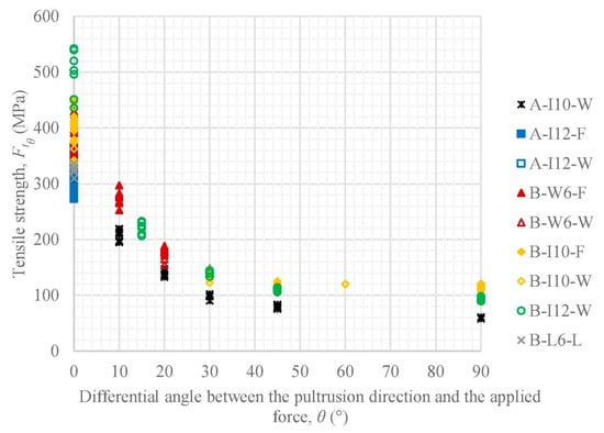 Figure 5. Tensile strength variation in pultruded FRP composites with load angle relative to fiber orientation [].