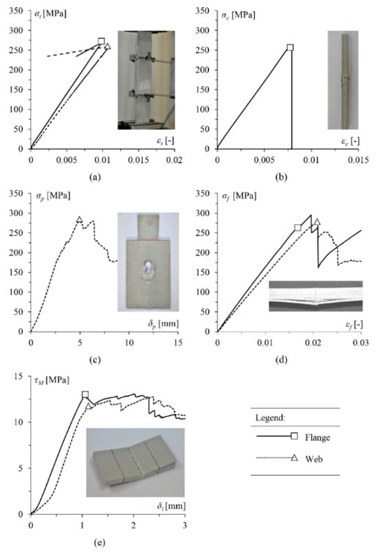 Landesmann et al. [] conducted an experimental investigation on pultruded glass fiber-reinforced polymer (GFRP) elements, reporting an average tensile strength of 253.3 MPa and a compressive strength of 262.3 MPa. The composites also exceeded E23 class standards for flexural and pin-bearing strengths. The modulus of elasticity averaged 24.5 GPa, and the interlaminar shear strength was 20.6 MPa, both meeting E17 class standards. As shown in Figure 6, different failure modes were observed during testing. Higher fiber content improved mechanical performance, with flange samples showing greater strength than web samples due to better fiber alignment. These findings confirm the suitability of E17-class GFRP elements for structural applications requiring high strength and stiffness.