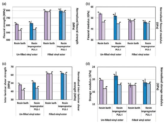 Hashemi et al. [] investigated pultruded hybrid kenaf/glass fiber composites and found that increasing the proportion of kenaf fibers led to a reduction in interlaminar shear strength (ILSS). The highest ILSS was recorded in non-hybrid glass fiber composites (21.5 MPa), while kenaf-rich composites exhibited the lowest values (10–12 MPa). This was due to the higher kenaf content resulting in increased impregnation issues and interface voids, weakening the fiber–matrix bonding. Irfan et al. [] explored the characteristics of glass fiber vinyl ester polymer composites produced using a modified pultrusion process. The experiments compared composites made with filled and unfilled vinyl ester resins combined with glass fibers. The results, summarized in Figure 7, highlighted key differences in mechanical behavior. The study found that unfilled resin composites exhibited lower flexural strength, likely due to de-bonding at the fiber–matrix interface. While interlaminar shear strength (ILSS) values were similar between the two pultrusion techniques, composites with filled resin demonstrated higher ILSS. Additionally, the storage modulus remained consistent across both pultrusion methods; however, composites made with unfilled resin showed a higher overall modulus.
