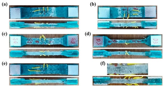 Figure 8. Failure modes of transverse short coupons: (a) fracture of rectangular long coupons; (b) fracture of rectangular short coupons; (c) fracture of dog-bone-shaped wide coupons; (d) fracture of dog-bone-shaped narrow coupons; (e) end failure; and (f) premature failure [].