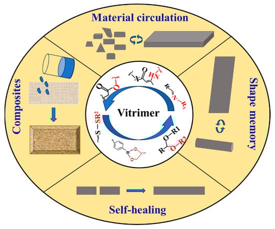 In solvent solutions, vitrimers can be depolymerized into monomers or oligomers. Once the solvent evaporates, these materials can be reprocessed or repolymerized, effectively restoring the vitrimer’s original structure and properties. This ability to maintain their persistent crosslinked network after multiple processing cycles enhances their longevity and usability. Owing to their unique reprocessability and structural resilience, vitrimers and their composite and nanocomposite derivatives are being applied across various fields. These applications include shape memory materials, self-healing polymers, adhesives, advanced printing processes, and other emerging sectors yet to be fully explored.