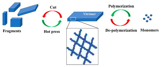 When vitrimer are exposed to external stimuli such as heat, light [], or chemical triggers, these networks undergo bond exchange reactions. Due to these reversible bond-exchange mechanisms, vitrimers can be considered recyclable thermosetting materials, offering a sustainable alternative to conventional thermosets. Figure 11 illustrates the fundamental mechanics of vitrimer recycling, including processes such as hot pressing and solvent-assisted reprocessing, which facilitate reshaping and reuse without compromising structural integrity.