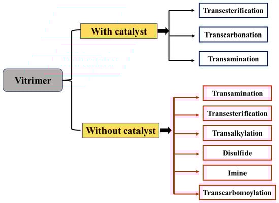 Thermosetting polymers are characterized by covalently crosslinked three-dimensional (3D) networks that form during the curing process [,]. Unlike thermoplastic polymers, these covalent bonds in thermosets are typically irreversible, even at elevated temperatures, leading to decomposition rather than melting. As a result, thermosets are traditionally considered non-recyclable, whereas thermoplastics can be readily remolded and recycled into new products. In some cases, thermoset resins have also been used as additives or fuel components []. Recent research has increasingly focused on developing polymers that combine the durability of thermosets with the processability of thermoplastics []. This has led to the creation of covalent adaptable networks (CANs), modified thermosetting materials that can respond to external stimuli, such as light, heat, electricity, pH, and moisture, allowing for reversible bond reconfiguration. Polymers incorporating these networks have been classified as vitrimers.