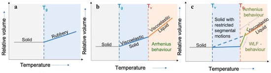 Figure 13. (a) Phase transition on thermoplastic and dissociative covalent material thermosetting vitrimer following (b) Tg below Tv and (c) Tv above Tg [].