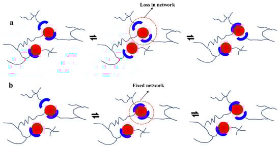 A significant example of this mechanism was demonstrated by Wudl and coworkers [], who developed a recyclable, self-healing thermosetting polymer based on the thermoreversible Diels–Alder reaction. This reversible reaction allows the material to self-heal and regains its original mechanical properties. Other studies have explored similar chemistries for healing thermosetting polymers, showing that when crosslink density decreases nonlinearly with rising temperature, material flow changes significantly but can be reversed upon cooling, restoring the material’s strength []. In contrast, the associative dynamic covalent adaptive network (ADCAN) maintains a stable crosslink density during the bond exchange process. As illustrated in Figure 14b, bond breaking and reformation occur simultaneously, allowing the network structure to rearrange without reducing connectivity [,]. This mechanism results in minimal changes to the macromolecular structure during the exchange, preserving the material’s integrity.