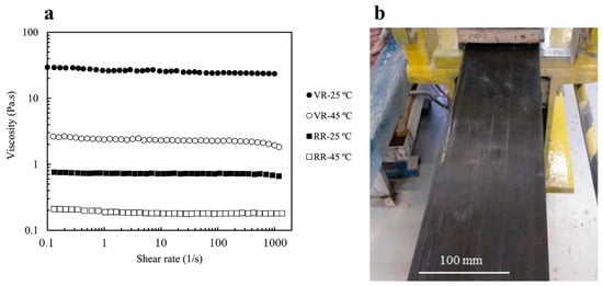 The fiber impregnation phase is a crucial step in the pultrusion technique. The process begins with the preparation of reinforcing materials, typically in the form of roving composed of glass, carbon, or aramid fibers []. The fibers are drawn into a resin bath for wetting which is essential to achieve consistent strength and interfacial bonding characteristics. After impregnation excess resin is subsequently removed, and the impregnated fibers pass through a guiding system for proper alignment []. Ensuring material compatibility of the resin and fiber is necessary for good adhesion and mechanical properties []. Moreover, factors such as resin viscosity, pulling speed, and the taper angle at the die entrance impact the pressure within the pultrusion die, thereby directly impacting fiber impregnation quality and void formation [,]. Manufacturers often strive to maintain void content below 5% to ensure optimal mechanical properties. Beyond traditional methods, advanced techniques have been developed to improve impregnation efficiency. Volk et al. [] and Dubé et al. [] examined a closed injection impregnation procedure, where resin is injected directly into the die. This method enables precise control over the resin-to-fiber ratio, promotes rapid impregnation, and minimizes exposure to volatile solvents, enhancing both process efficiency and environmental safety compared to conventional pultrusion techniques. The closed injection impregnation technique uses resin better and makes less pollution than open-bath systems, however it is harder to use with vitrimer resins. Vitrimer viscosity is substantially affected by dynamic bond exchange processes, which makes it behave in a non-linear way with temperature. This is different from regular thermosets. For instance, vitrimer matrices that use transesterification chemistry usually have a sharp decrease in viscosity beyond 120–140 °C. On the other hand, disulfide- and imine-based systems soften at lower temperatures, between 80 and 110 °C. These changes make it harder to inject stable resin, moisten it, and soak up fibers. To deal with these problems, process changes can consist of (i) preheating the resin container to stabilize viscosity before injection, (ii) adjusting the catalyst concentration to find the right balance between reactivity and flow stability, (iii) adding reactive diluents or rheological additives to lower baseline viscosity, and (iv) using in-line viscosity monitoring with feedback-controlled pumps. Literature indicates that sustaining viscosity between the 0.5 and 2.0 Pa·s during impregnation is generally adequate to provide uniform fiber wetting in closed injection settings [,,,].