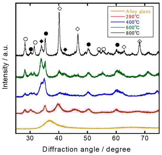 The initial alloy glass was prepared according to the following procedure. The mixture of 99.6 wt% pure zirconium, 99.99 wt% pure palladium, and 99.99 wt% pure platinum metal was melted in a purified argon (Ar) atmosphere on a water-cooled copper mold in an arc furnace []. The chemical composition of the alloy was determined to be Zr65Pd30Pt5, which corresponds to the atomic ratio. Samples of the ribbon form with a thickness of approximately 0.02 mm and a width of approximately 1 mm were prepared from the molten alloy using the single-roll melt-quench spinning method in an Ar atmosphere. The resulting alloy glass was subsequently heated in air at 280 °C for 24 h and 400 °C, 600 °C, and 800 °C for 3 h.