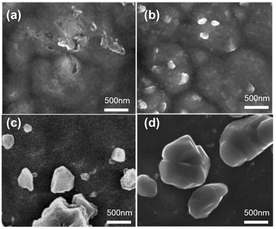 Figure 2 shows the SEM images of the morphology of the Zr65Pd30Pt5 after heat treatment in air at 280 °C for 24 h and 400 °C, 600 °C, and 800 °C for 3 h, respectively. The microstructure indicated the formation of the composite in which granular precipitates were dispersed in the matrix. Precipitates with diameters ranging from approximately 10 nm to 2 µm appeared on the surface. The average grain size of the particles was 36 nm (280 °C), 92 nm (400 °C), 210 nm (600 °C), and 408 nm (800 °C), respectively, where the values in parentheses represent the heat treatment temperatures (HTTs).