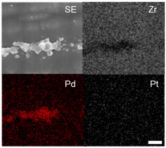 Figure 3 shows the sets of the SEM and the chemical elemental mapping image of the sample heated in air at 600 °C for 3 h, revealing the presence of the precipitates. The elemental distribution indicates that these precipitates mainly consist of Pd and are embedded in the ZrO2 matrix. Although the image of the distribution of Pt exhibited low contrast in the figures, its existence appeared to be analogous to that of Pd. The Pd (Pt) phase in these composites was broadly characterized as being isolated in the matrix ZrO2.