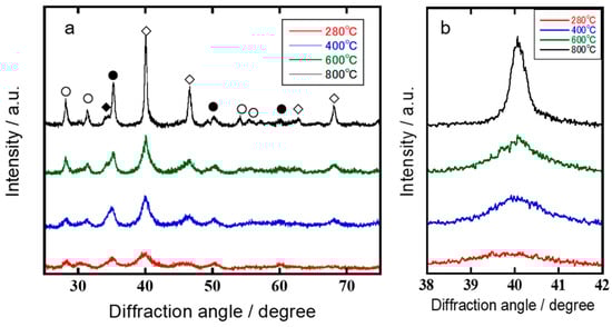 Figure 4 shows the XRD patterns of the samples, which were obtained after PCT measurement. They demonstrate that the PdO phase underwent a transformation into metallic Pd following mild H2 treatment across all samples. However, no discernible morphological alterations were observed in the samples after PCT measurement. As illustrated in Figure 4b, the XRD peaks of Pd (111) exhibited broad features. The d-spacing of Pd-Pt (111), assuming the presence of a single peak, was calculated to be 0.2258 nm (280 °C), 0.2250 nm (400 °C), 0.2249 nm (600 °C), and 0.2250 nm (800 °C), where the values in parentheses represent HTT. The fraction of Pd was calculated using the d-spacing of Pd (111) (0.2246 nm) and Pt (111) (0.2265 nm). The resulting values for x were 0.36 (280 °C), 0.84 (400 °C), 0.81 (600 °C), and 0.84 (800 °C), respectively, for PdxPt1−x. The values were consistent with the starting composition of Pd and Pt, i.e., x = 0.857, within the error range under conditions where HTT exceeded 400 °C. In the case of 280 °C, the Pt metal phase appears to precipitate initially, forming Pt-rich crystallites. The crystallite size of the Pd phase particles was found to be 5.3 nm (280 °C), 7.8 nm (400 °C), 11.0 nm (600 °C), and 26.0 nm (800 °C), respectively. It was observed that both crystallite and grain sizes increased with increasing HTT. The former was smaller than the latter, indicating the precipitates of the polycrystalline grains.
