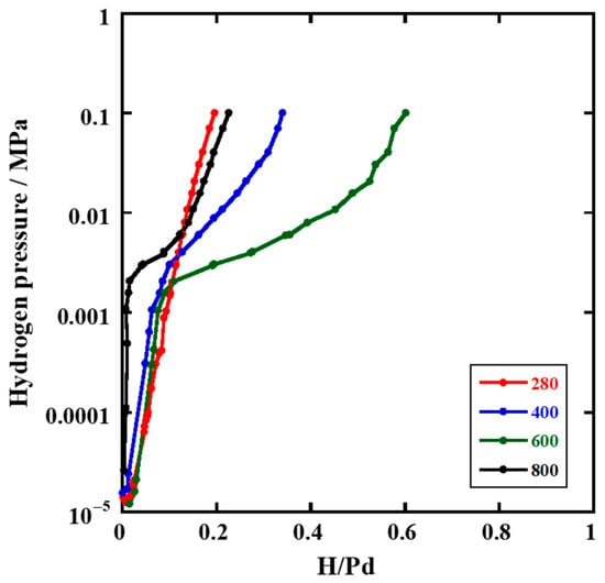 Figure 5 shows the PCT isotherms versus the hydrogen-to-platinum (H/Pd) ratio at 30 °C for four samples, which were prepared at 280, 400, 600, and 800 °C, respectively. These isotherms reveal the distinct behavior exhibited by the samples in terms of hydrogen absorption. Notably, pure Pd generally exhibits a pressure plateau in relation to the H/Pd atomic ratio [,]. However, the line corresponding to the sample oxidized at 280 °C showed a monotonic increase in hydrogen amount versus pressure on the logarithmic scale. Conversely, the samples prepared at 400 and 600 °C exhibited a plateau region within gradient isotherms. In contrast, the samples oxidized at 800 °C also showed the gradient isotherm, though the plateau region was comparatively diminished in terms of hydrogen storage capacity. The hydrogen storage capacity from the plateau region evaluated in the present experiment was determined to be H/Pd = 0.30, 0.61, and 0.20 for the sample oxidized at 400 °C, 600 °C, and 800 °C, respectively.