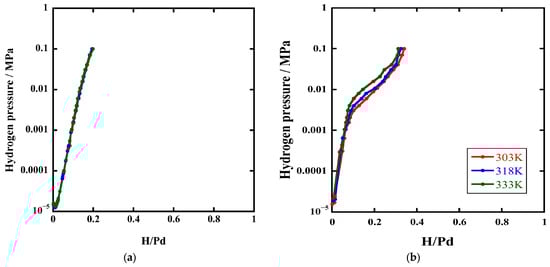 The evaluation of hydrogen storage properties was conducted with a gas volumetric apparatus (Microtruck Bell Belsorp-max, Tokyo, Japan). First, 0.5 g of the sample was loaded into the chamber. The hydrogen pressure–concentration isotherm (denoted as PCT) was obtained at different temperatures of 30 °C, 45 °C, and 60 °C. The initial measurement at 60 °C was used as a pretreatment, and then the measurements were obtained at 30 °C, 45 °C, and 60 °C in that sequence. The dead volume of the sample chamber was measured at each temperature, and the samples were vacuum-evacuated to remove absorbents. This procedure was repeated for the subsequent measurements at the next temperature. During the PCT measurements, the samples were held at each pressure for 60 s to reach an equilibrium state before moving to the next pressure. The temperature-dependent PCT data were analyzed using the van’t Hoff equation to derive the thermodynamic constants.