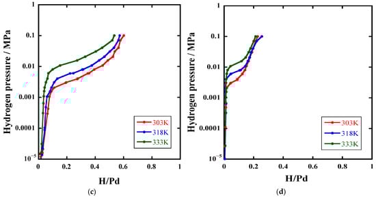 Figure 6a–d show the temperature-dependent hydrogen storage behaviors of the four samples, representing the PCT curves at 30 °C, 45 °C, and 60 °C, respectively. As the temperature increased, the curves shifted to higher pressure. As shown in Figure 5 and Figure 6, a novel observation has been made concerning the difference between the oxidized Zr65Pd30Pt5 sample at different temperatures. It is assumed that this phenomenon is influenced by both the matrix and the intrinsic effects on the Pd-based metal phase in these composites. The amount of absorbed hydrogen appears to be contingent on the pressure; however, the profile in the oxidized sample at 280 °C (Figure 6a) seems to represent a monotonic relation between log PH2 vs. H/Pd. In contrast, the samples oxidized at 400 °C and 600 °C (Figure 6b,c) show hydrogen absorption behavior, characterized by a plateau region with a gradient. Initially, the amount of hydrogen absorbed increased logarithmically with hydrogen pressure before reaching the plateau region. The samples oxidized at 800 °C (Figure 6d) exhibited an analogous hydrogen absorption behavior, although the maximum H/Pd appeared to be reduced.