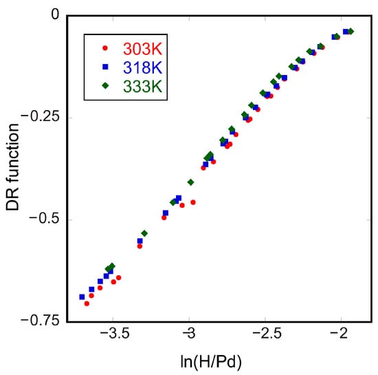 Figure 7. Dubinin–Radushkevich (D–R) plots of ln(H/Pd) versus DR function (= −RTln(P/P0)2) for the oxidized Zr65Pd30Pt5 samples after heat treatment in air at 280 °C.