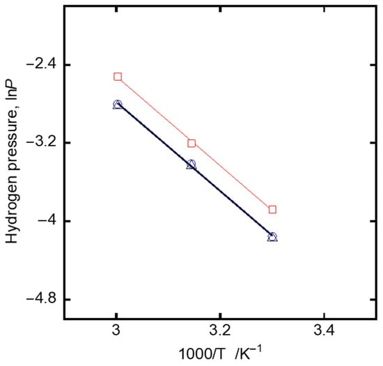where ΔH° and ΔS° are the equilibrium enthalpy and entropy changes, respectively, and R is the gas constant. The equilibrium pressure of hydrogen, pH2, in the plateau region is related to the absolute temperature T. The plateau pressures increased due to the decreased stability of the hydride phase. The PCT curves of three samples (oxidized at 400 °C, 600 °C, and 800 °C) exhibited such a shift with respect to the plateau pressure, depending on the measurement temperature.