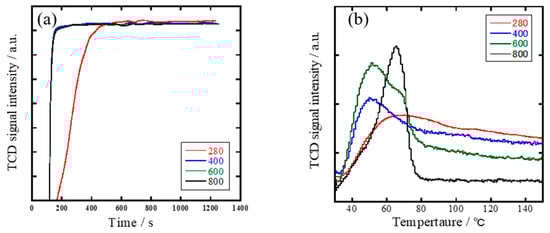 Figure 9. The TPR profile of absorption and release of H2. Panel (a): The H2-TPR profile of the four Pd/ZrO2 samples. The heat treatment condition is in air at 280 °C for 24 h (red and 400 °C (blue), 600 °C (green), and 800 °C (black) for 3 h, respectively, as a reference to Pd black (black). Panel (b): The TPR profile of hydrogen release during the heating ramp experiment. The samples are the same as in (a).
