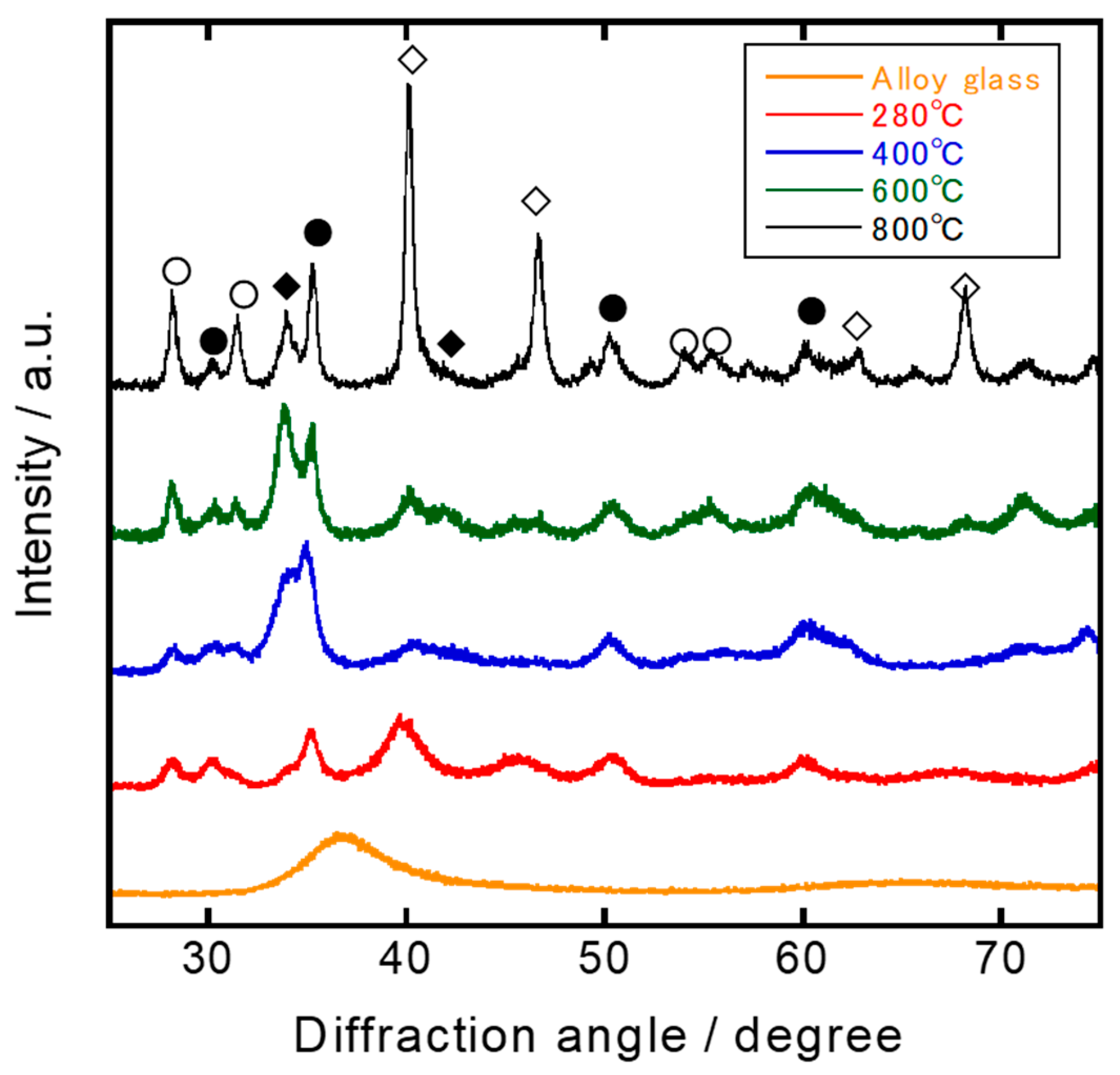- The XRD and surface morphology of the alloy glass after heat treatment in air at 280–800 °C showed a precipitated structure consisting of metallic Pd-Pt particles on the matrix of ZrO2.