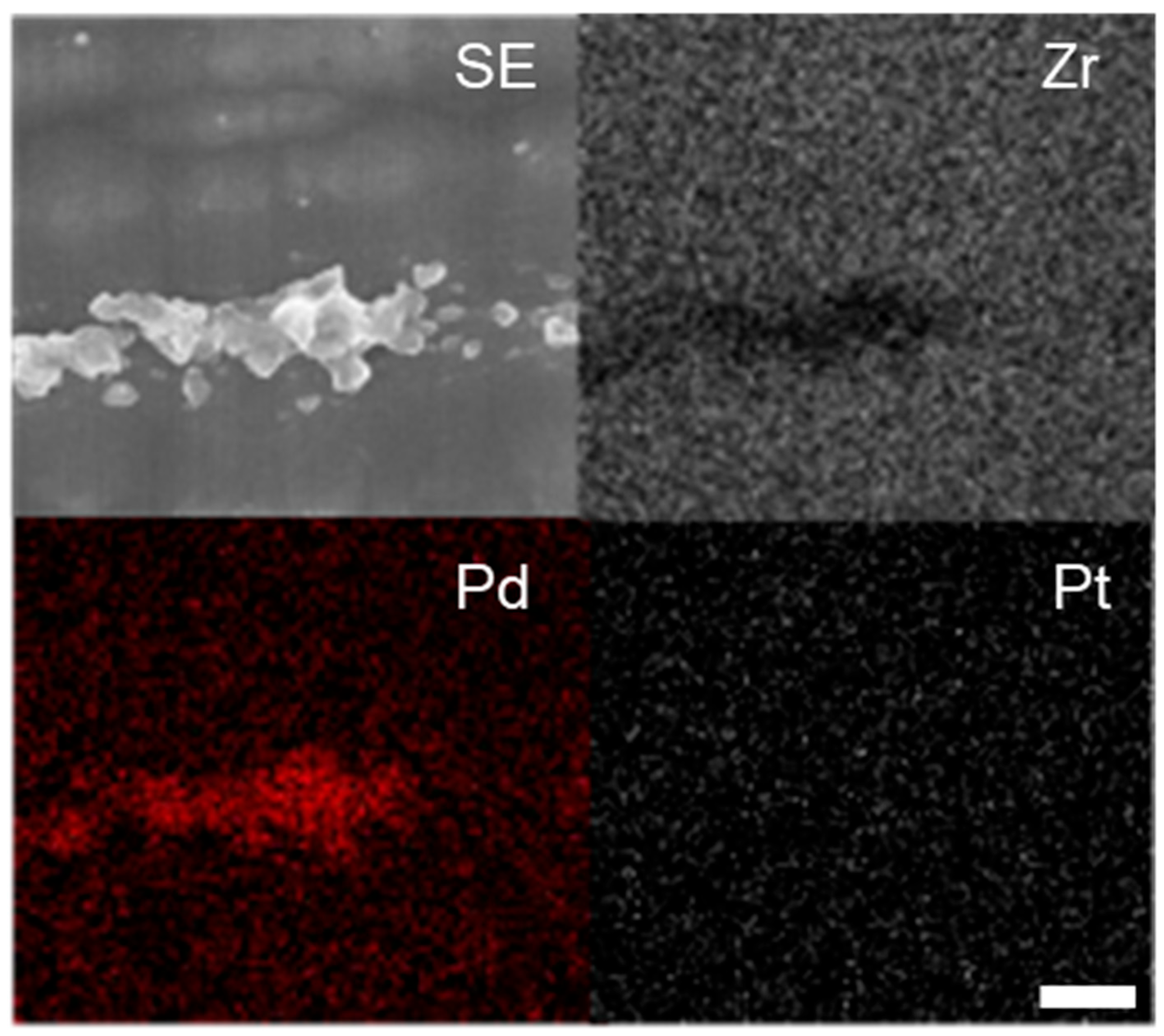- Ozawa, M.; Masuda, A.; Nakamura, M.; Hattori, M.; Kato, H.; Yamamura, S. Soot-Combustion Catalyst of Pd/ZrO2 Composites Prepared from Zr65Pd35 Amorphous Alloy by Oxidation Treatment. Jpn. J. Appl. Phys. 2020, 59, SAAC06. [Google Scholar] [CrossRef]
