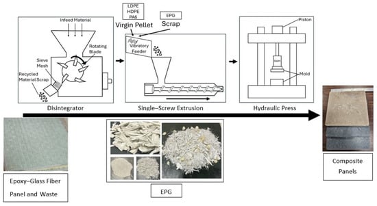 Epoxy–glass fiber–polyurethane foam-based thermoset composite scraps (EPG), consisting of woven glass fiber-reinforced epoxy layers and a polyurethane foam core, were used as filler material. These sandwich panels, with average thicknesses of 5 mm and 15 mm, were manufactured via vacuum-assisted resin transfer molding (VARTM) and the scraps were supplied by the UAB Materials Processing and Applications Development (MPAD) Center, USA. Mechanically recycled EPG scraps were compounded with three different thermoplastic matrices: high-density polyethylene (HDPE), low-density polyethylene (LDPE), and polyamide 6 (PA6). HDPE and LDPE, both polyethylene-based, differ in molecular architecture: HDPE has a linear chain structure with high crystallinity (>90%), while LDPE features a highly branched configuration with lower crystallinity (~50–60%). HDPE (MaxxamTR FR PE V0 Natural 70; ρ = 1.26 g/cm3, tensile strength at break 8.4 MPa, MFI 15 g/10 min) and LDPE (MaxxamTR FR PE 112 Natural; ρ = 0.97 g/cm3, tensile strength at break 10.3 MPa, MFI 9.0 g/10 min) were supplied by Avient Corporation, Birmingham, AL, USA. The PA6 matrix (Nylene 401D; ρ = 1.14 g/cm3, tensile strength at break 80 MPa) was supplied by Nylene, Henderson, KY, USA.